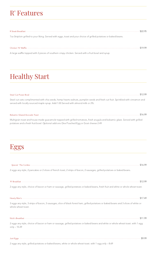 3 slices of French loaf dipped in egg, cream and a hint of vanilla. Topped with cinnamon, icing sugar and seasonal fruit. Served with maple syrup and butter.